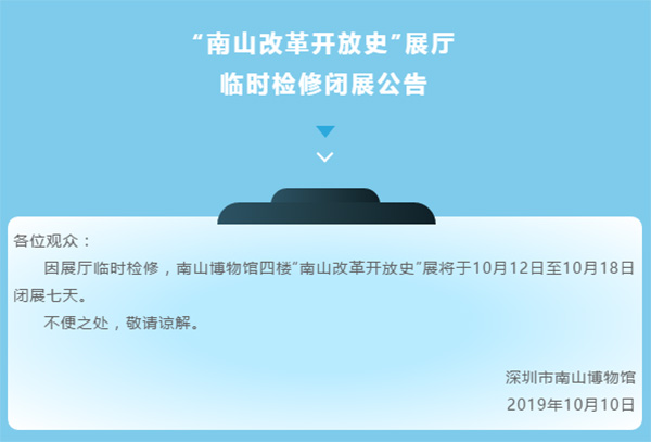 近日,深圳南山博物館發(fā)布通告,因展廳臨時(shí)檢修,南山博物館四樓“南山改革開放史”展將于10月12日至10月18日閉展七天。